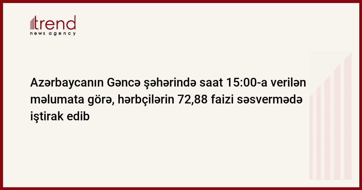 Azərbaycanın qərbində yerləşən Gəncə şəhərində (paytaxt Bakıdan 365 kilometr aralı) saat 15:00-a verilən məlumata görə, hərbçilərin 72,88 faizi səsvermədə iştirak edib.