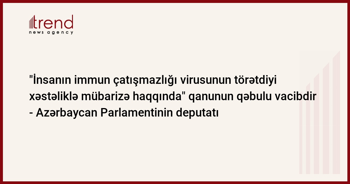 Azərbaycan Parlamentinin deputatı hesab edir ki, "İnsanın immun çatışmazlığı virusunun törətdiyi xəstəliklə mübarizə haqqında" qanun layihəsinin qəbulu çox vacibdir.