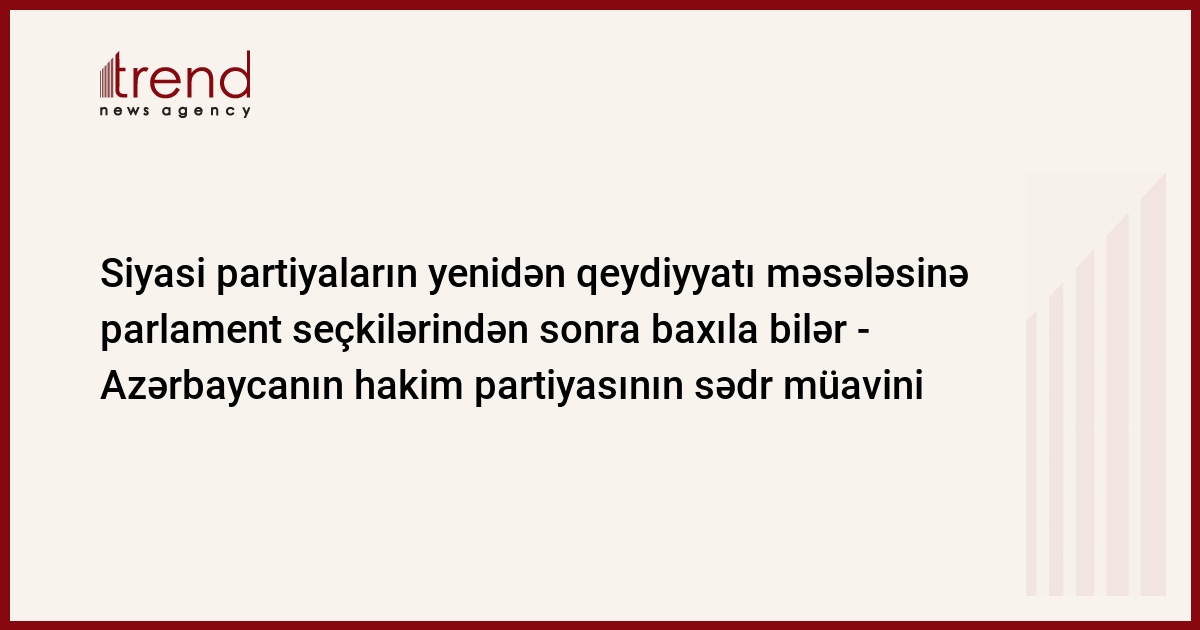Azərbaycanın hakim partiyasının sədr müavini hesab edir ki, ölkədə siyasi partiyaların yenidən qeydiyyatı məsələsinə parlament seçkilərindən sonra baxıla bilər.