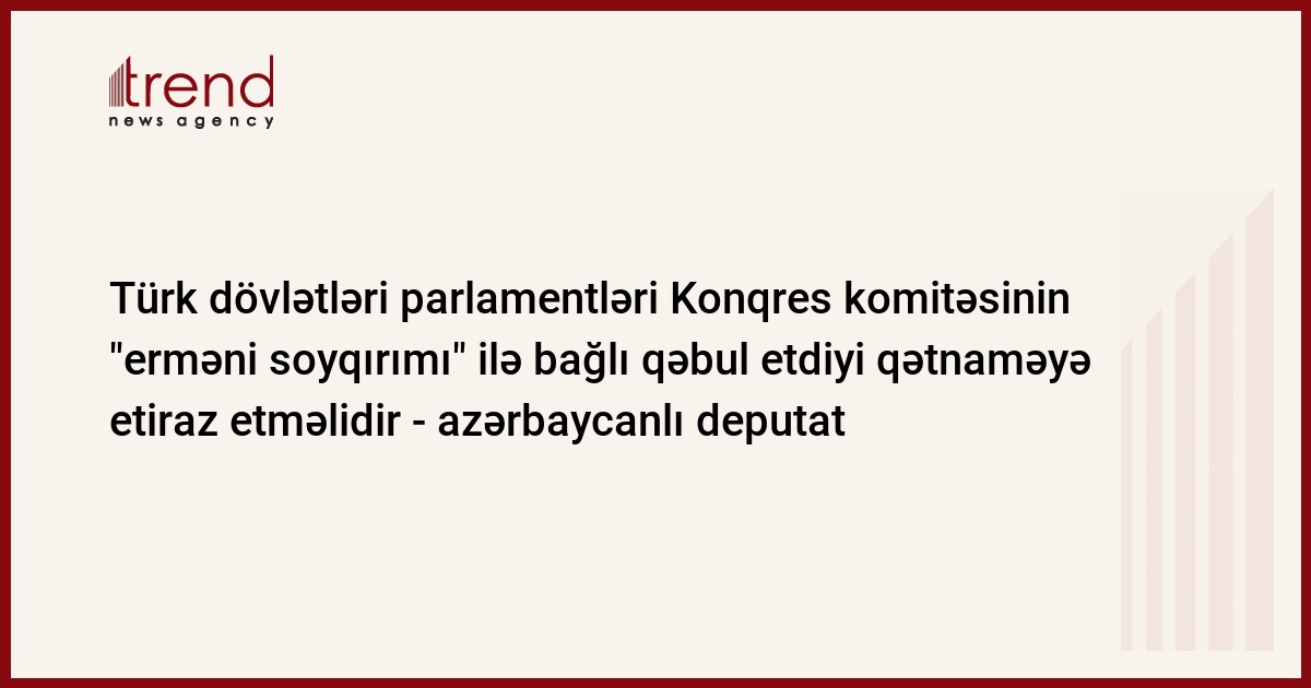 Türk dövlətləri parlamentləri ABŞ Konqresi Nümayəndələr Palatası Xarici əlaqələr komitəsinin qondarma "erməni soyqırımı"nın tanınmasına dair qəbul etdiyi qətnaməyə etiraz etməlidirlər. Trend -un məlumatına görə, bunu cümə günü jurnalistlərə Azərbaycan Parlamentinin deputatı Qənirə Paşayeva bildirib.