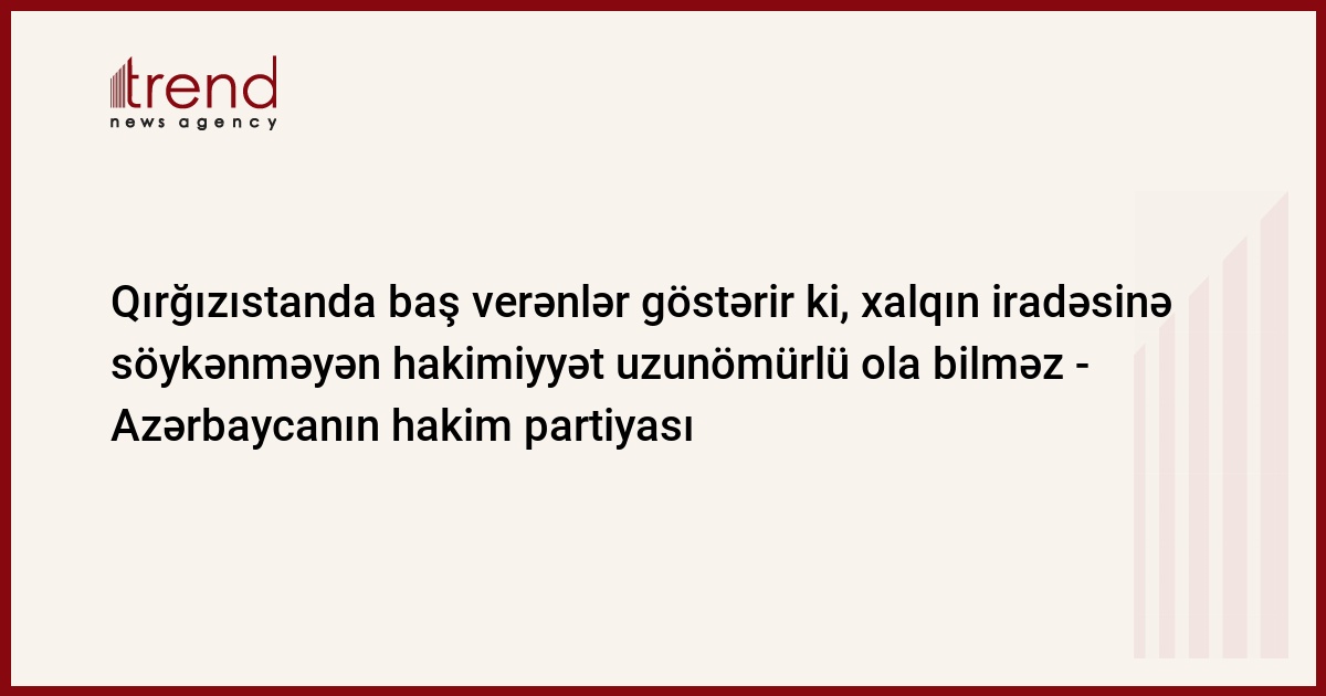 "Qırğızıstanda baş verənlər göstərir ki, xalqın iradəsinə söykənməyən hakimiyyət uzunömürlü ola bilməz", - Trend-in məlumatına görə, cümə axşamı jurnalistlərə Yeni Azərbaycan Partiyası (YAP) sədrinin müavini, icra katibi Əli Əhmədov bildirib.