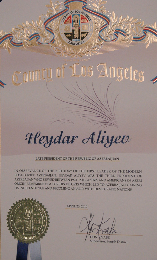 Azərbaycanın Baş Konsulluğunda Los-Anceles dairəsinin (Los Angeles County) rəhbərliyi adından rəsmi təbriklərin təqdim olunması mərasimi keçirilib. Protokol xidmətinin nümayəndəsi baş konsul Elin Süleymanova fəxri fərman təqdim edilib. Orada Ümummilli Lider Heydər Əliyevin Azərbaycanın müstəqilliyinin bərqərar olmasındakı xidmətləri qeyd edilib.