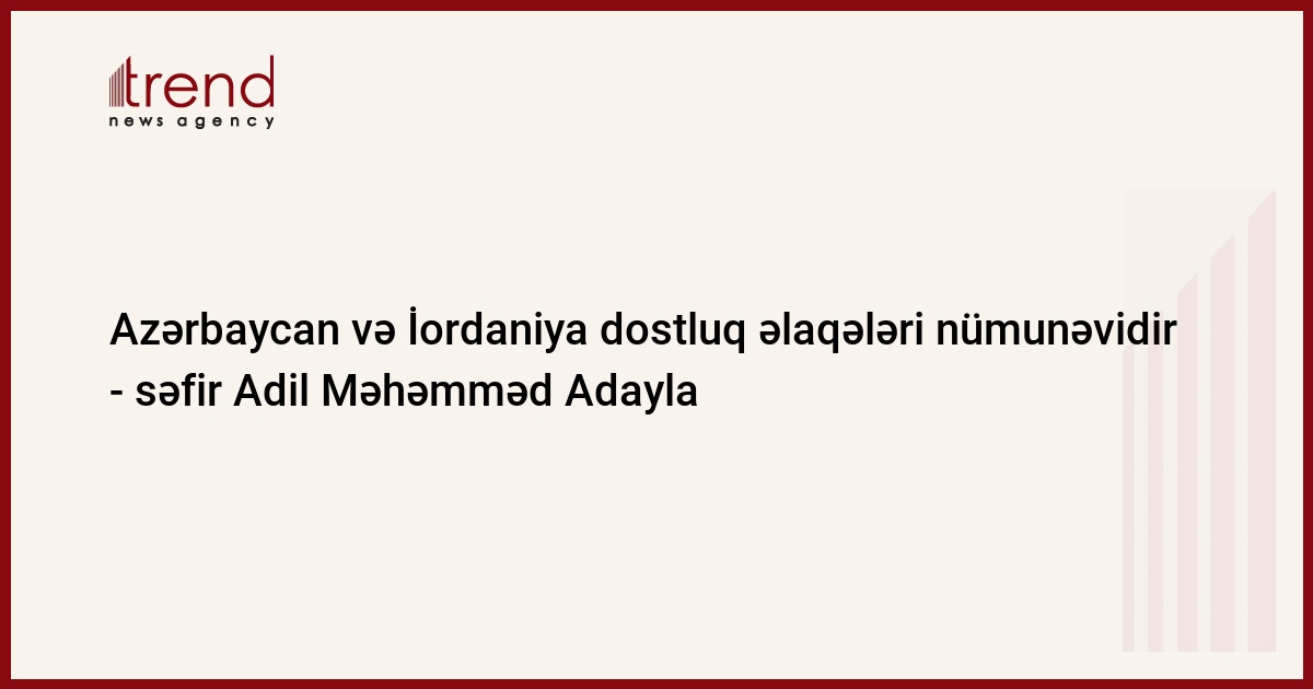 İordanıya Haşimi Krallığının Azərbaycandakı fövqəladə və səlahiyyətli səfiri Adil Məhəmməd Adayla, bu ölkə başçısının Azərbaycana səfəröncəsi, Trend-ə bildirib ki, İordaniya Kralı əlahəzrət Kral II Abdullah və Azərbaycan Prezidenti cənab İlham Əliyev arasında olan yaxın dostluq əlaqələri iki qardaş dövlət arasında əlaqələrin daha da möhkəmlənməsində öz əksini tapıb.
