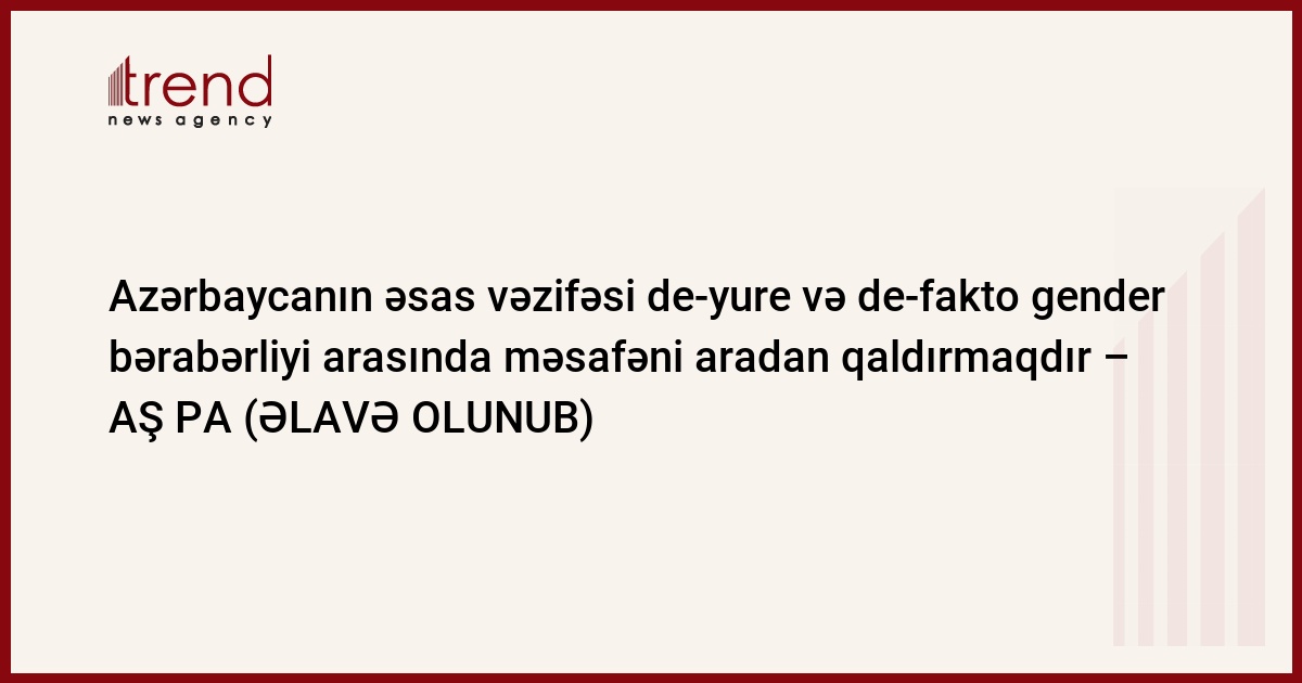 Bakıda keçirilən "Gender bərabərliyi" konfransının işində iştirak edən AŞ PA nümayəndələri bu sahədə Azərbaycanda qanunvericilik səviyyəsində uğurların əldə olunmasını qiymətləndiriblər və onların praktikada reallaşdırılması üçün gələcəkdə işlərin görülməsinə çağırıblar. Çünki ölkədə de-yure və de-fakto gender bərabərliyi arasında böyük məsafə mövcuddur.