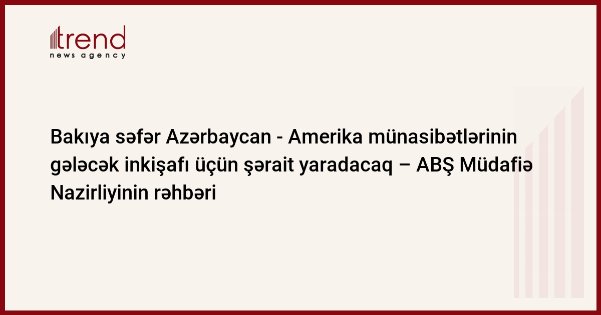 Bakıya səfər Azərbaycan - Amerika münasibətlərinin gələcək inkişafına müsbət təkan verəcək. Bu barədə ABŞ müdafiə naziri Robert Geyts Azərbaycana səfərinin yekunları ilə bağlı bildirib. Bu barədə Pentaqonun saytında dərc olunmuş məlumatda deyilir.