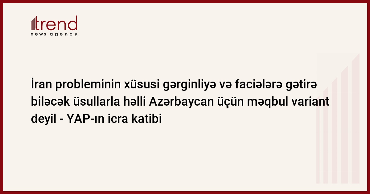 YAP-ın icra katibi hesab edir ki, İran probleminin xüsusi gərginliyə və faciələrə gətirə biləcək üsullarla həlli Azərbaycan üçün məqbul variant deyil.