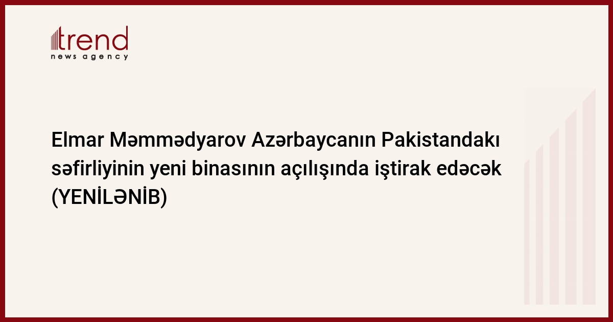 Azərbaycan xarici işlər naziri Elmar Məmmədyarov çərşənbə axşamı Pakistana birgünlük səfəri zamanı Azərbaycanın İslamabad şəhərində yerləşən səfirliyinin yeni binasının açılışında iştirak edəcək. Bu barədə Trend-ə səfirliyin mətbuat katibi Vüsal Süleymanov bildirib.