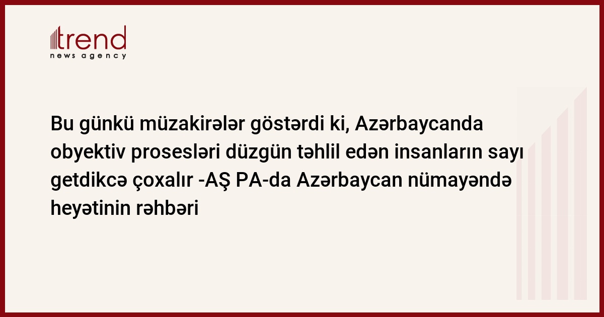 Bu günkü müzakirələr göstərdi ki, Azərbaycanda obyektiv, real prosesləri düzgün təhlil edən insanların sayı getdikcə çoxalır. Trend-in məlumatına görə, bu fikirləri çümə axşamı jurnalistlərə açıqlamasında AŞ PA-da Azərbaycan nümayəndə heyətinin rəhbəri Səməd Seyidov "Azərbaycanda demokratik təsisatların fəaliyyət" adlı hesabatla bağlı müzakirələrin nəticəsinə münasibət bildirərkən deyib.