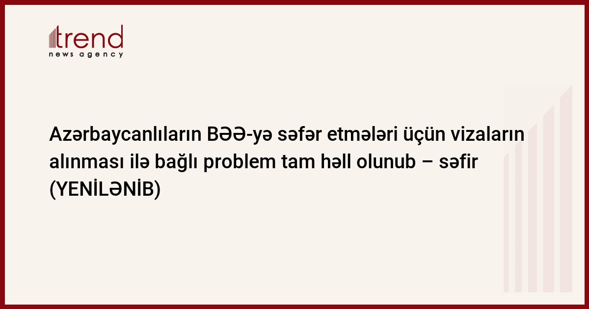 Azərbaycanlıların Birləşmiş Ərəb Əmirliklərinə (BƏƏ) səfər etmələri üçün vizaların alınması ilə bağlı problem tam həll olunub. Bu barədə Azərbaycanın bu ölkədəki səfiri Elxan Qəhrəmanov çərşənbə axşamı Trend-ə məlumat verib.