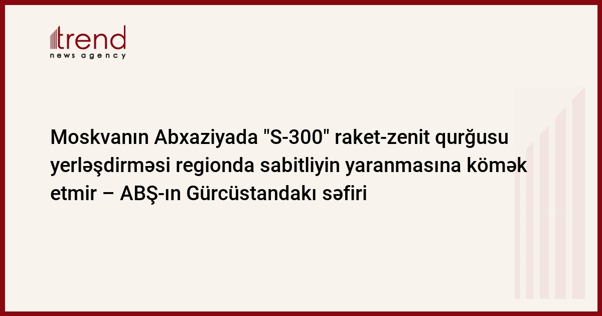 Moskvanın Abxaziyada "S-300" raket-zenit qurğusunu yerləşdirməsi regionda sabitliyin yaranmasına kömək etmir. Bu barədə ABŞ-ın Gürcüstandakı səfiri Con Bas bu gün Moskvanın Abxaziyada "S-300" raket-zenit qurğusunun yerləşdirməsi barədə məlumatı şərh edərkən bildirib.