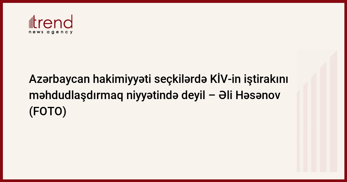 Bu il Azərbaycanda keçiriləcək Parlament seçkilərində KİV-in fəaliyyətini məhdudlaşdıran heç bir inzibati resursdan istifadə olunmayacaq. Bunu ATƏT Bakı Ofisinin təşkilatçılığı ilə "Seçkilərin mediada əks etdirilməsi" mövzusunda keçirilən "dəyirmi masa"dakı çıxışında Prezident Administrasiyası İctimai-siyasi məsələlər şöbəsinin müdiri Əli Həsənov deyib.