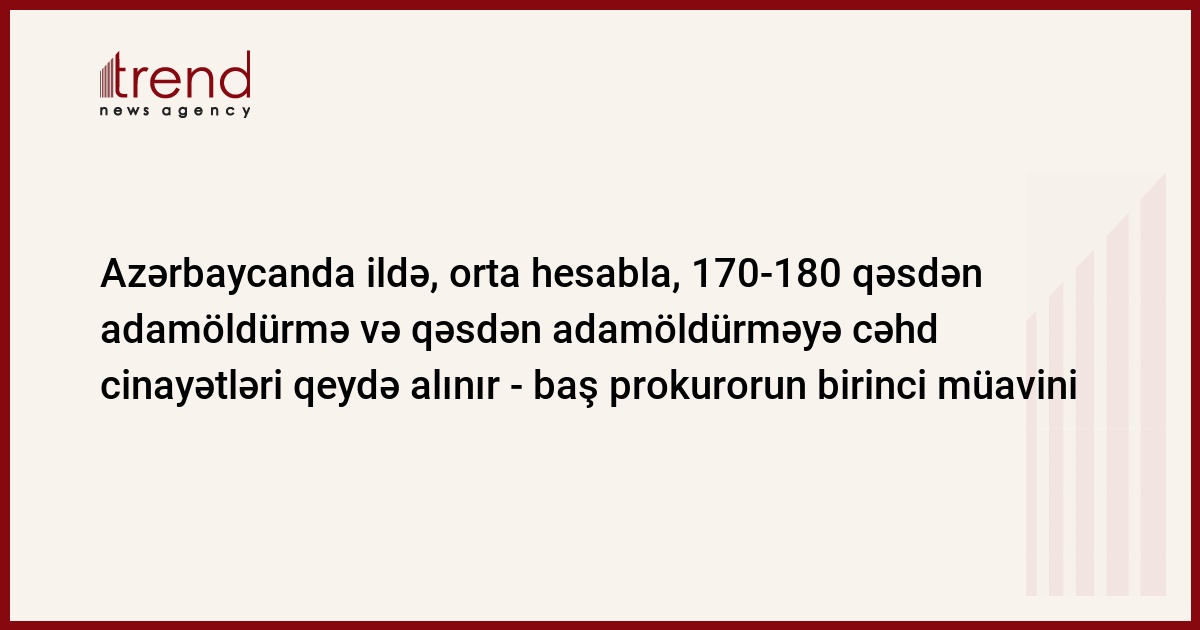 Azərbaycanda ildə, orta hesabla, 170-180 qəsdən adamöldürmə və qəsdən adamöldürməyə cəhd cinayətləri qeydə alınır. Trend-in məlumatına görə, bu barədə cümə axşamı jurnalistlərə baş prokurorun birinci müavini Rüstəm Usubov bildirib.