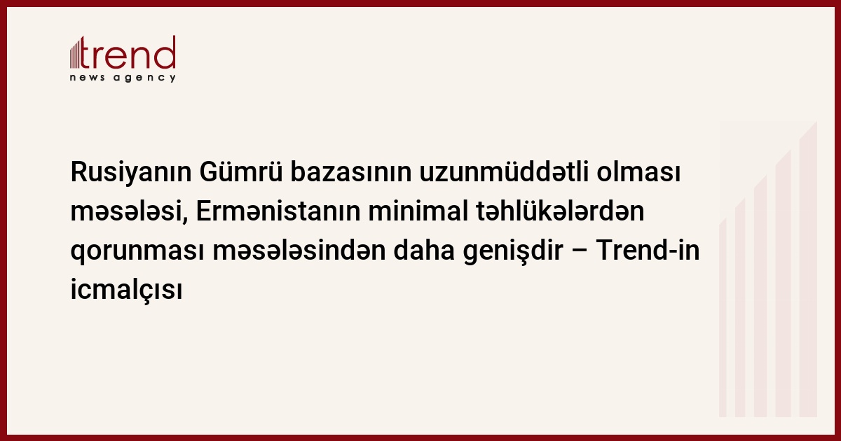 Rusiya hərbi bazasının Gümrüdə fəaliyyət müddətinin uzadılması Qərb və digər ölkələrə anlamağa imkan verir ki, Zaqafqaziya Moskvanın Vaşinqton və Aİ ölkələrindən daha loyal yanaşdığı İrana qarşı mübarizədə istifadə oluna bilməz.