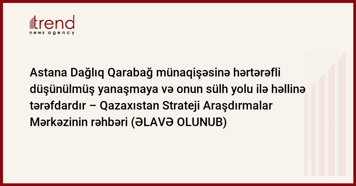 Astana Ermənistan - Azərbaycan, Dağlıq Qarabağ münaqişəsinə hərtərəfli düşünülmüş yanaşmaya və onun sülh yolu ilə həllinə tərəfdardır. Bu barədə Qazaxıstan Strateji Araşdırmalar Mərkəzinin direktoru Bulat Sultanov bazar ertəsi Bakıda "dəyirmi masa" formatında keçirilən iclasda bəyan edib.