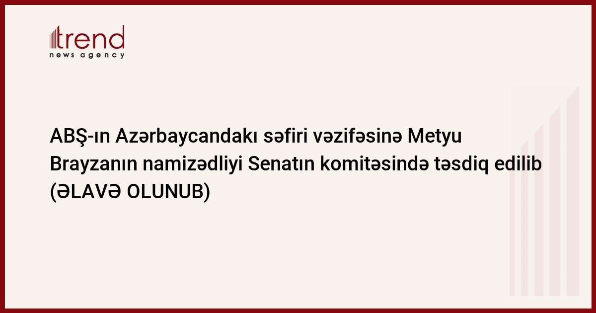 Çərşənbə axşamı ABŞ Senatının Xarici əlaqələr komitəsi ATƏT MQ-nin keçmiş həmsədri, ABŞ dövlət katibi köməkçisinin Avropa və Avrasiya məsələləri üzrə keçmiş müavini Metyu Brayzanın ABŞ-ın Azərbaycandakı səfiri vəzifəsinə namizədliyini təsdiq edib. Bu barədə "Azadlıq" radiosunun saytı məlumat verib.