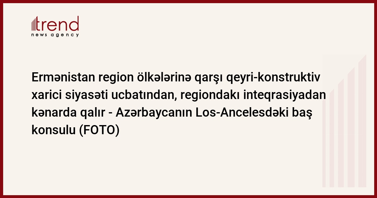 Ermənistan region ölkələrinə qarşı qeyri-konstruktiv xarici siyasəti ucbatından regiondakı inteqrasiyadan kənarda qalır. Trend-in məlumatına görə, bu barədə Azərbaycanın Los-Ancelesdəki baş konsulu Elin Süleymanov Kaliforniya ştatında yerləşən Çəpmən Universitetində (Chapman University) Azərbaycana həsr olunmuş mühazirəsi zamanı deyib.