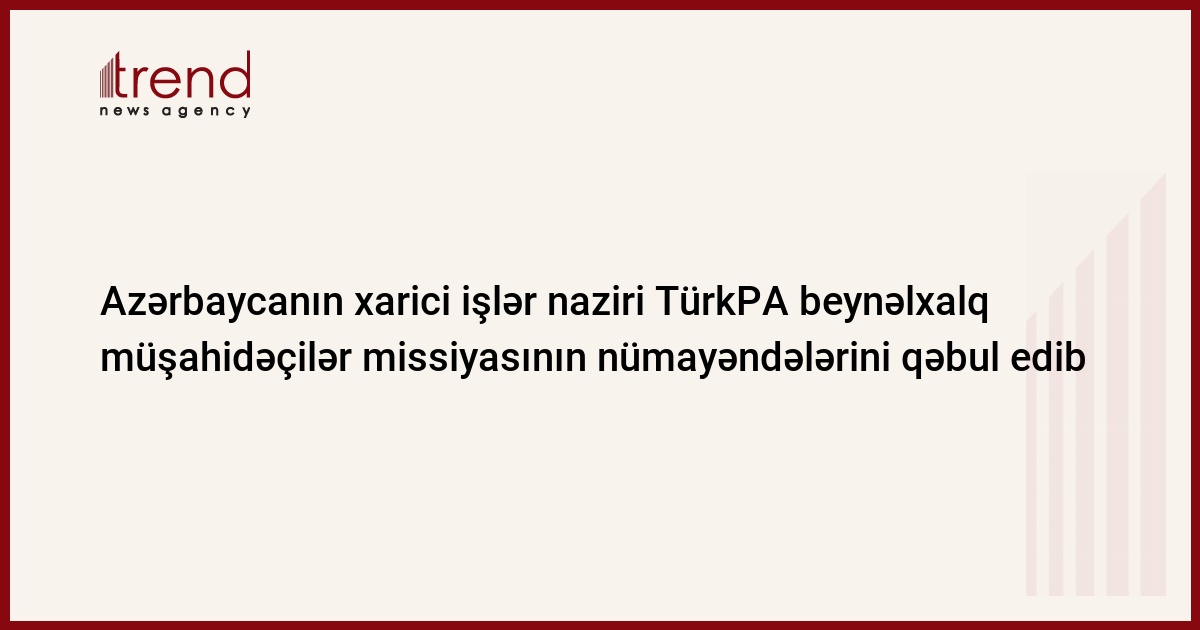 Azərbaycanın xarici işlər naziri Elmar Məmmədyarov cümə günü Türkdilli ölkələrin Parlament Asambleyasının (TürkPA) beynəlxalq müşahidəçilər missiyasının nümayəndələrini qəbul edib. Bu barədə Xarici İşlər Nazirliyinin məlumatında deyilir.