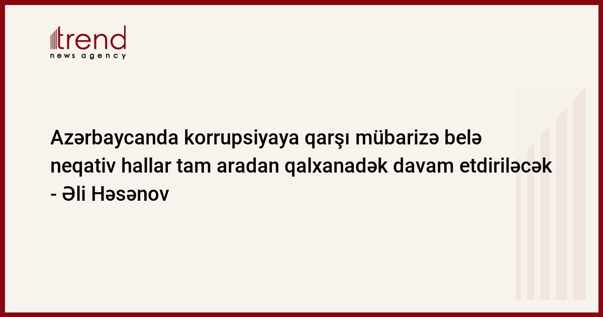 Azərbaycanda korrupsiyaya qarşı mübarizə belə neqativ hallar tam aradan qalxanadək davam etdiriləcək. Bunu Trend-ə Azərbaycan Prezidenti Administrasiyasının İctimai-siyasi məsələlər şöbəsinin müdiri Əli Həsənov bildirib.