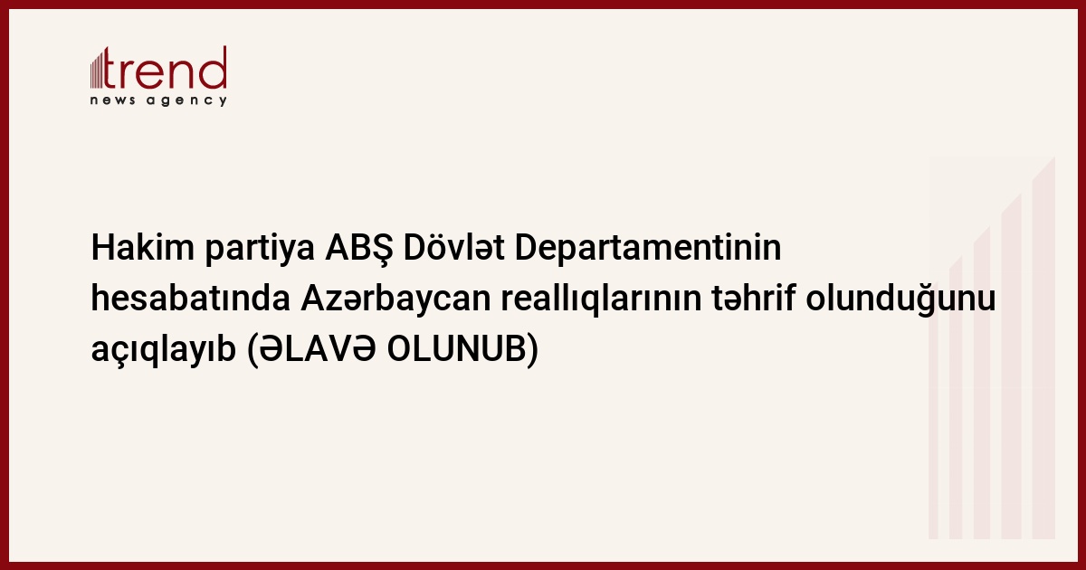 Azərbaycanın hakim partiyası ABŞ Dövlət Departamentinin hesabatında Azərbaycan reallıqlarının təhrif olunduğunu açıqlayıb.