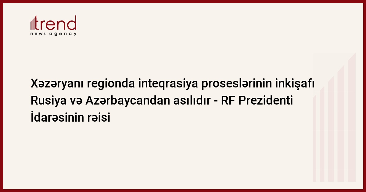 Xəzər regionunda inteqrasiya proseslərinin inkişafı daha çox Rusiya və Azərbaycandan asılıdır. Bunu bu gün Həştərxanda açılan II Rusiya-Azərbaycan regionlararası forumunda RF Prezidentinin Xarici ölkələrlə regionlararası və mədəni əlaqələr İdarəsinin rəisi Sergey Vinokurov bildirib. Bu barədə Trend-in xüsusi müxbiri məlumat verir.