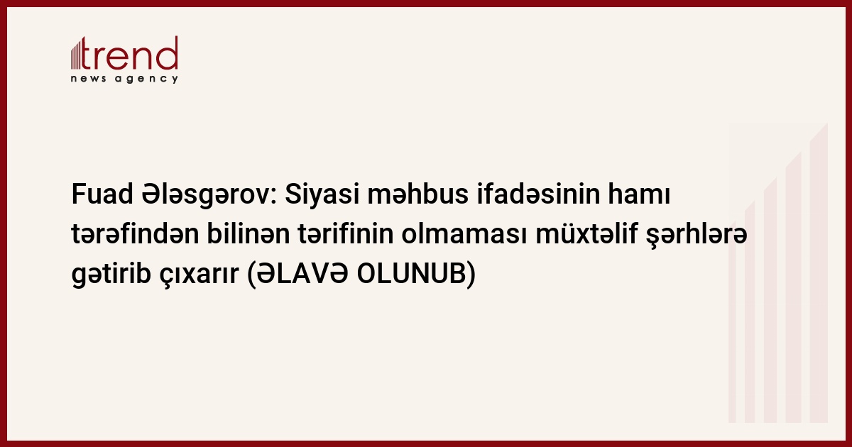 Problem ondadır ki, siyasi məhbus ifadəsinin hamı tərəfindən bilinən tərifi yoxdur. Bu vəziyyət siyasi məhbus ifadəsinin müxtəlif şərhlərinə gətirib çıxarır. Trend-in məlumatına görə, bu barədə Azərbaycan Prezidenti Administrasiyasının Hüquq-mühafizə orqanları ilə iş şöbəsinin müdiri Fuad Ələsgərov cümə günü Bakıda keçirilən "Siyasi məhbus" anlayışının vahid tərifinin qəbul edilməsi zərurəti" adlı beynəlxalq konfransda çıxışı zamanı deyib.