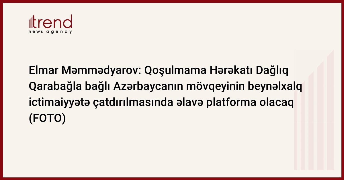 Qoşulmama Hərəkatı Ermənistan-Azərbaycan, Dağlıq Qarabağ münaqişəsi ilə əlaqədar Azərbaycanın ədalətli mövqeyinin beynəlxalq ictimaiyyətə daha geniş şəkildə çatdırılması üçün əlavə platforma olacaq. Bunu Azərbaycanın xarici işlər naziri Elmar Məmmədyarov İndoneziyanın Bali adasında keçirilən Qoşulmama Hərəkatının 16-cı Nazirlər Konfransının yekun iclasında bildirib. Bu barədə Trend-ə Azərbaycan XİN-in mətbuat xidmətindən məlumat verilib.