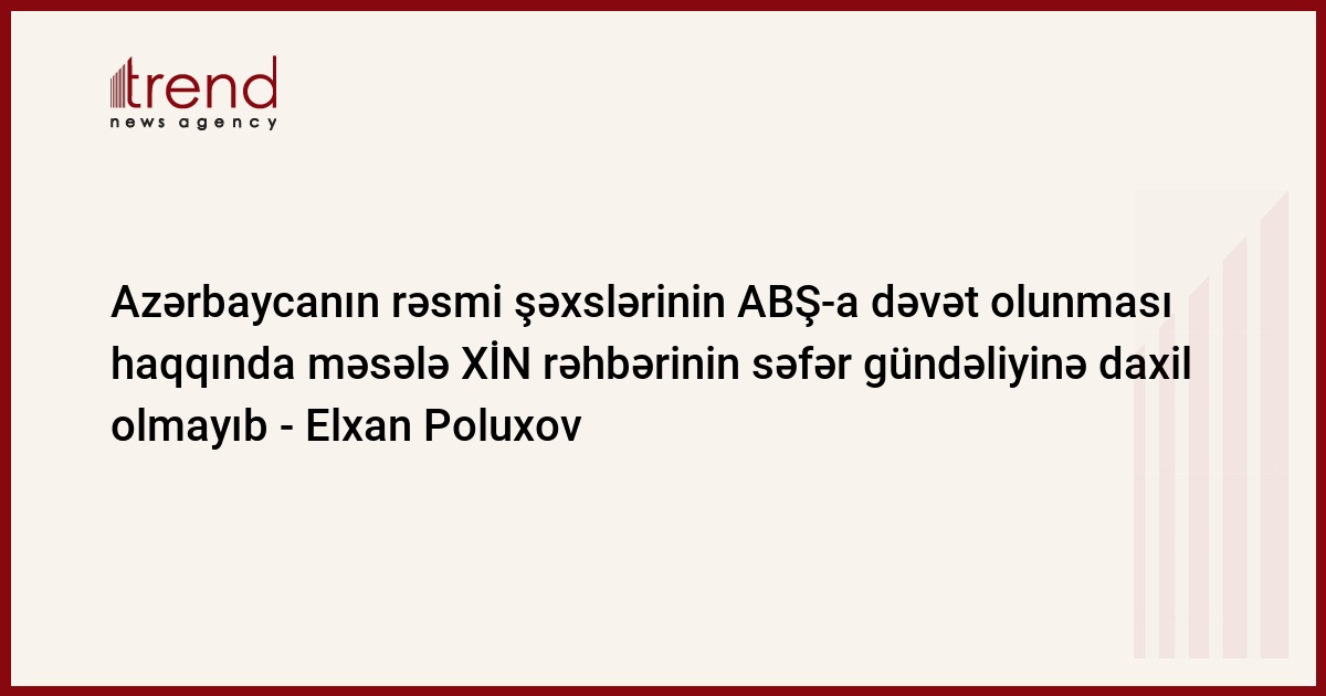 Azərbaycanın rəsmi şəxslərinin ABŞ-a dəvət olunması haqqında məsələ müzakirə edilməyib və xarici işlər naziri Elmar Məmmədyarovun Vaşinqtona bu yaxınlardakı səfərinin gündəliyinə daxil olmayıb. Trend-in məlumatına görə, bu barədə Azərbaycan XİN-in rəsmi nümayəndəsi Elxan Poluxov çərşənbə günü məlumat verib.