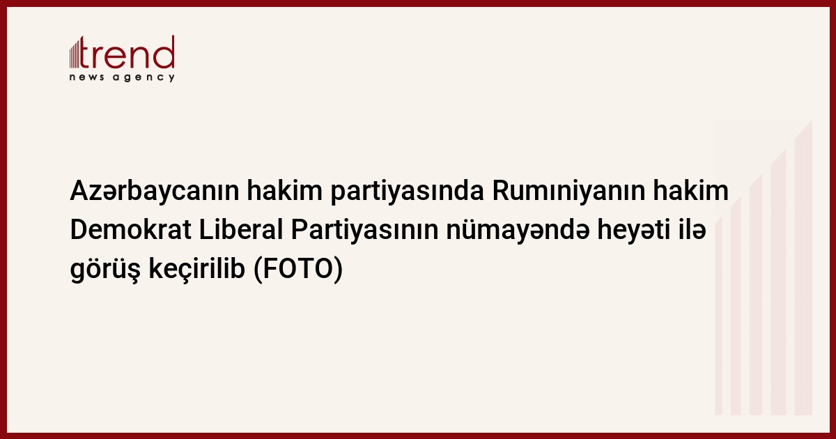 Hakim Yeni Azərbaycan Partiyasının (YAP) qərargahında Rumıniyanın hakim Demokrat Liberal Partiyasının nümayəndə heyəti ilə görüş keçirilib. Tend-in məlumatına görə, görüşdə YAP-ın sədr müavini - icra katibi Əli Əhmədov Azərbaycanla Rumıniya arasında sıx dostluq və əməkdaşlıq əlaqələrinin olduğunu bildirib və əlavə edib ki, hər iki ölkənin hakim partiyaları arasındakı münasibətlərin genişləndirilməsi olduqca əhəmiyyətlidir.