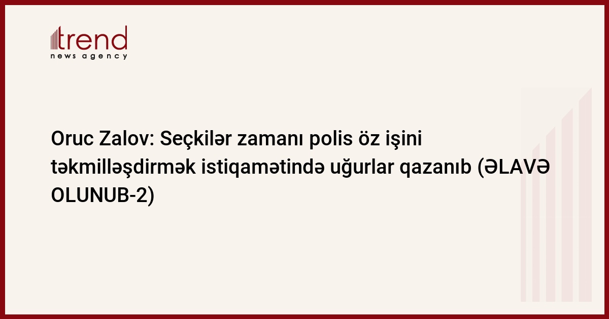 Müstəqillik dövründə keçirilən seçkilər zamanı polis öz işini təkmilləşdirmək, yeni qanunvericiliyi tətbiq etməklə bağlı uğurlar qazanıb. Trend-in məlumatına görə, dairə seçki komissiyaları (DSK) sədrləri üçün keçirilən seçki hüququ üzrə kurslarda çıxışı zamanı daxili işlər nazirinin müavini Oruc Zalov deyib.
