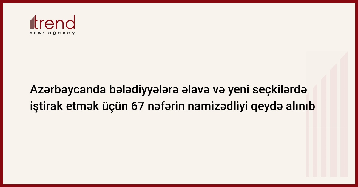 Azərbaycanda bələdiyyələrə əlavə və yeni seçkilərdə iştirak etmək üçün indiyədək 464 yerə 1177 nəfər namizədliyini verib, onlardan 67 nəfəri qeydə alınıb. Trend-in məlumatına görə, bu barədə Mərkəzi Seçki Komissiyasının cümə günü keçirilən iclasında komissiya sədri Məzahir Pənahov deyib.