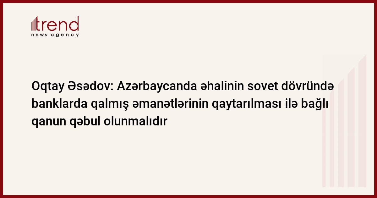 Azərbaycanda əhalinin sovet dövründə banklarda qalmış əmanətlərinin qaytarılması üçün vəsait var və hökumət tərəfindən bu mexanizmin hazırlanması üçün işlər aparılır. Trend-in məlumatına görə, bu barədə Milli Məclisin çərşənbə axşamı keçirilən iclasında spiker Oqtay Əsədov deyib.