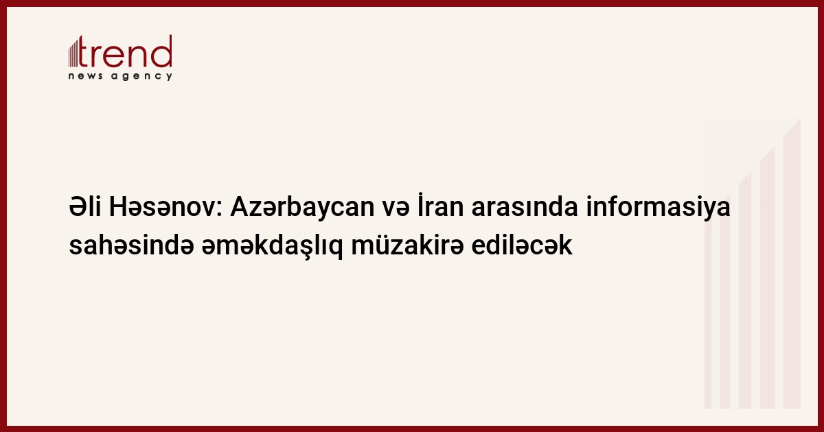 Azərbaycan və İran arasında informasiya sahəsində əməkdaşlıq, ölkədaxili proseslərin işıqlandırılması, sərhəd boyu televiziya və radio yayımı sahəsində mövcud olan vəziyyət müzakirə ediləcək. Bunu çərşənbə axşamı Trend-ə açıqlamasında Prezident Administrasiyasının İctimai-siyasi məsələlər şöbəsinin müdiri Əli Həsənov deyib.