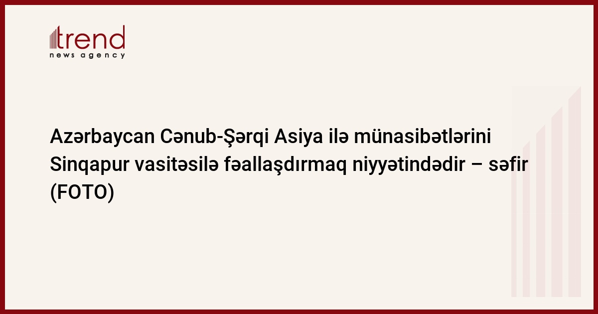 Azərbaycan Cənub-Şərqi Asiya ölkələri ilə münasibətlərini fəallaşdırmaq və bu niyyətini Sinqapur vasitəsilə həyata keçirmək fikrindədir. Trend-in məlumatına görə, bunu Azərbaycanın İndoneziya, eyni zamanda, Filippin, Timor-Leste və Sinqapurda akkreditə olunmuş fövqəladə və səlahiyyətli səfiri Tamerlan Qarayev Sinqapurun xarici işlər naziri Kasivisvanat Şanmuqamla görüşündə bildirib.