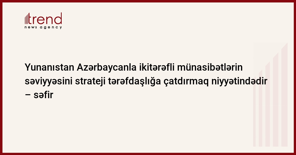 Yunanıstan Azərbaycanla ikitərəfli münasibətlərin səviyyəsini strateji tərəfdaşlığa çatdırmaq niyyətindədir. Trend-in məlumatına görə, bu barədə Yunanıstanın Azərbaycandakı səfiri İoannis Metaksas iki ölkə arasında diplomatik əlaqələrin qurulmasının 20 illiyinə həsr olunmuş konfransda deyib.
