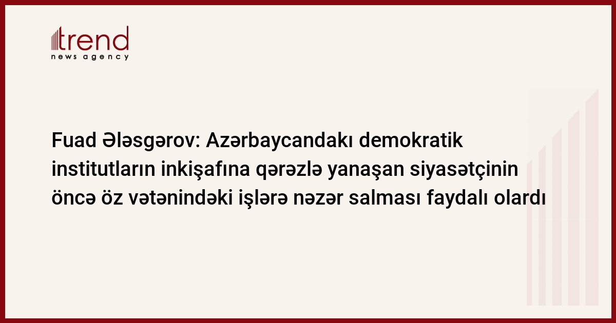 "Hesab edirəm ki, hansısa ölkədə vəziyyətə dair məruzə hazırlamaq fikrində olan, lakin bu ölkəyə səfər etməkdən imtina edən, Azərbaycandakı demokratik institutların inkişafı prosesinə açıq-aydın qərəzlə yanaşan siyasətçinin öncə öz vətənindəki işlərə nəzər salması faydalı olardı", - Ələsgərov deyib.