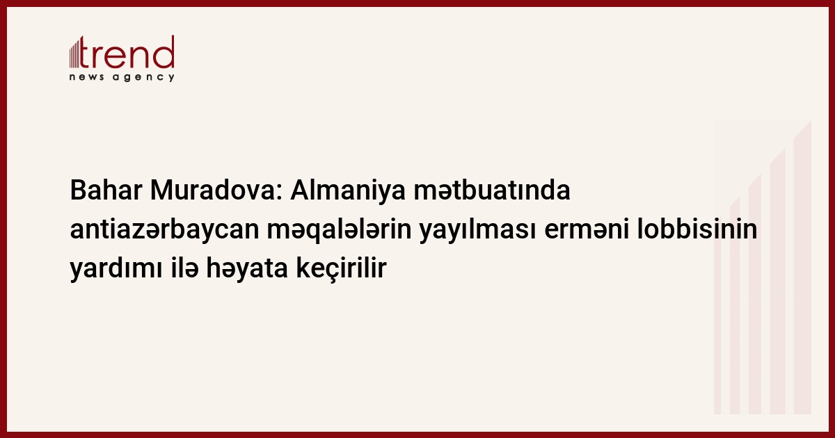 "Cox təəssüf ki, son illər Almaniya və digər Qərb mətbuatında Azərbaycanın uğur və inkişafını görməzliyə vuran və onu başqa məsələlərlə bağlayan yazıların şahidi oluruq. Bu da Azərbaycanı istəməyən dairələrin, xüsusilə erməni lobbisi və onların maraqlarına xidmət edən dairələrin yardımı ilə həyata keçirilir", - Trend-in məlumatına görə, cümə axşamı jurnalistlərə vitse-spiker Bahar Muradova deyib.