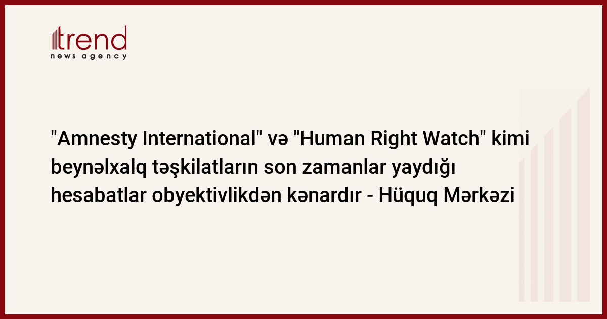 "Amnesty International" və "Human Right Watch" kimi beynəlxalq təşkilatların son zamanlar yaydığı hesabatlar obyektivlikdən kənardır. Bunu Trend-ə şənbə günü Müstəqil Elmi Praktik Hüquq Mərkəzinin rəhbəri Aydın Kərimov bildirib.