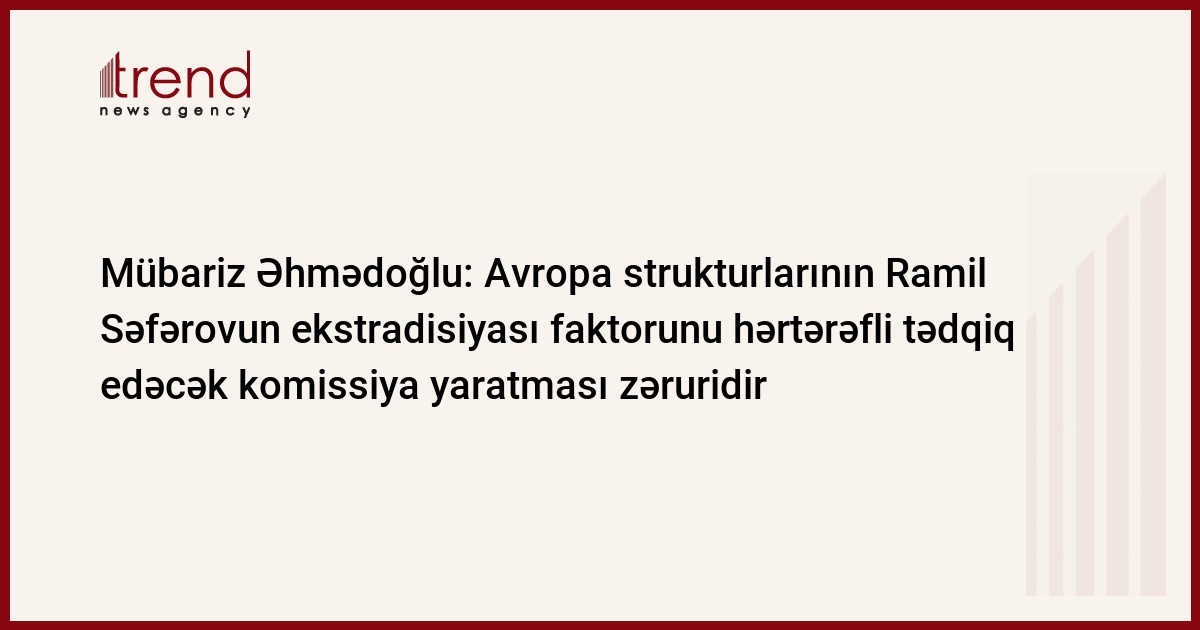 "Ramil Səfərovun ekstradisiyası faktorunda tarixi rəqabətin və məhkəməyə təzyiqlərin rolunu nəzərə alsaq, avroparlamentarilərin qəbul etdiyi qətnaməni yersiz və ya vaxtından əvvəl qəbul edilmiş qətnamə adlandırmaq olar. Ona görə də, ədalətin bərpası üçün Avroparlamentin təkbaşına və ya digər avrostrukturlarla birlikdə tarixi rəqabətə söykənən erməni-azərbaycanlı münasibətlərinin tarixi parametrləri, Ramil Səfərovun məhkəməsində baş verənləri və yaxınlarda olmuş ekstradisiyasını tədqiq edən komissiya yaratması çox vacibdir", - Əhmədoğlu qeyd edib.