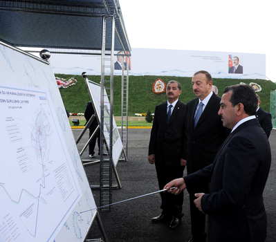 Azərbaycan Prezidenti İmişli şəhərinin su və kanalizasiya sisteminin yenidən qurulması layihəsinin situasiya planını və İmişli şəhər su anbarları kompleksinin baş planını əks etdirən stendlərə baxdı.