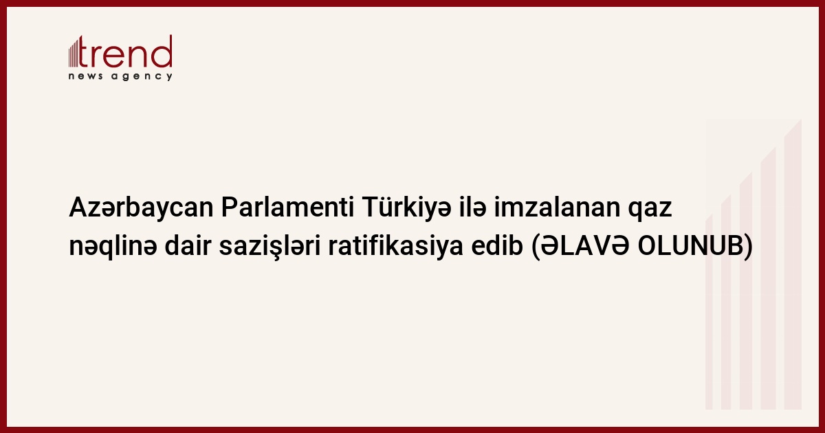 Trend-in məlumatına görə, parlamentin çərşənbə axşamı keçirilən iclasında Azərbaycan və Türkiyə hökumətləri arasında təbii qazın Türkiyəyə satışı və Azərbaycandan gələn təbii qazın Türkiyənin ərazisindən nəql edilməsi üçün müstəqil boru kəmərinin inşasına dair saziş, həmçinin "Azərbaycan Höküməti və Türkiyə Höküməti arasında Trans-Anadolu təbii qaz boru kəməri sisteminə dair" saziş də ratifikasiya edilib.