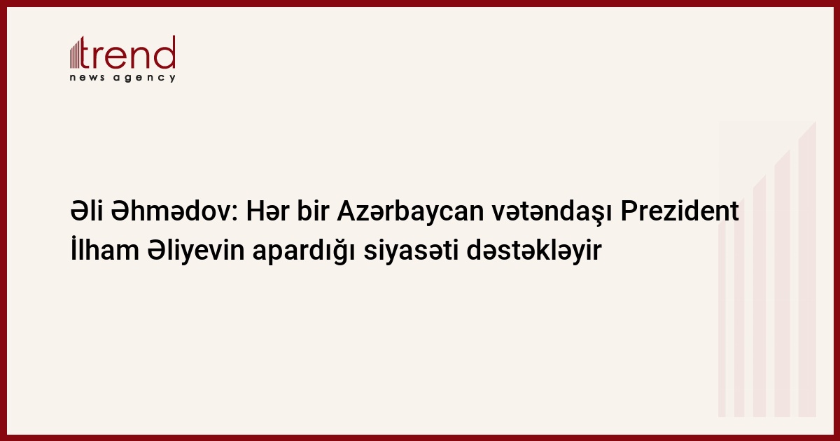 Prezident seçkilərinə toxunan Əli Əhmədov deyib ki, hər bir Azərbaycan vətəndaşı Prezident İlham Əliyevin apardığı siyasəti dəstəkləyir və daim onun arxasında dayanır.