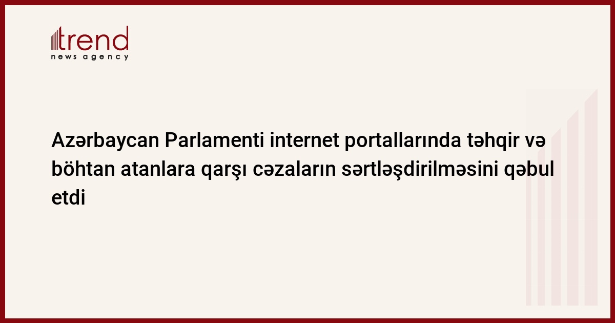 Trend-in məlumatına görə, Milli Məclisin çərşənbə axşamı keçirilən iclasında Cinayət Məcəlləsinə təklif olunan dəyişikliklərə əsasən, internet portallarında da şəxsi təhqir və böhtan atmağa görə cəzalar sərtləşdiriləcək.