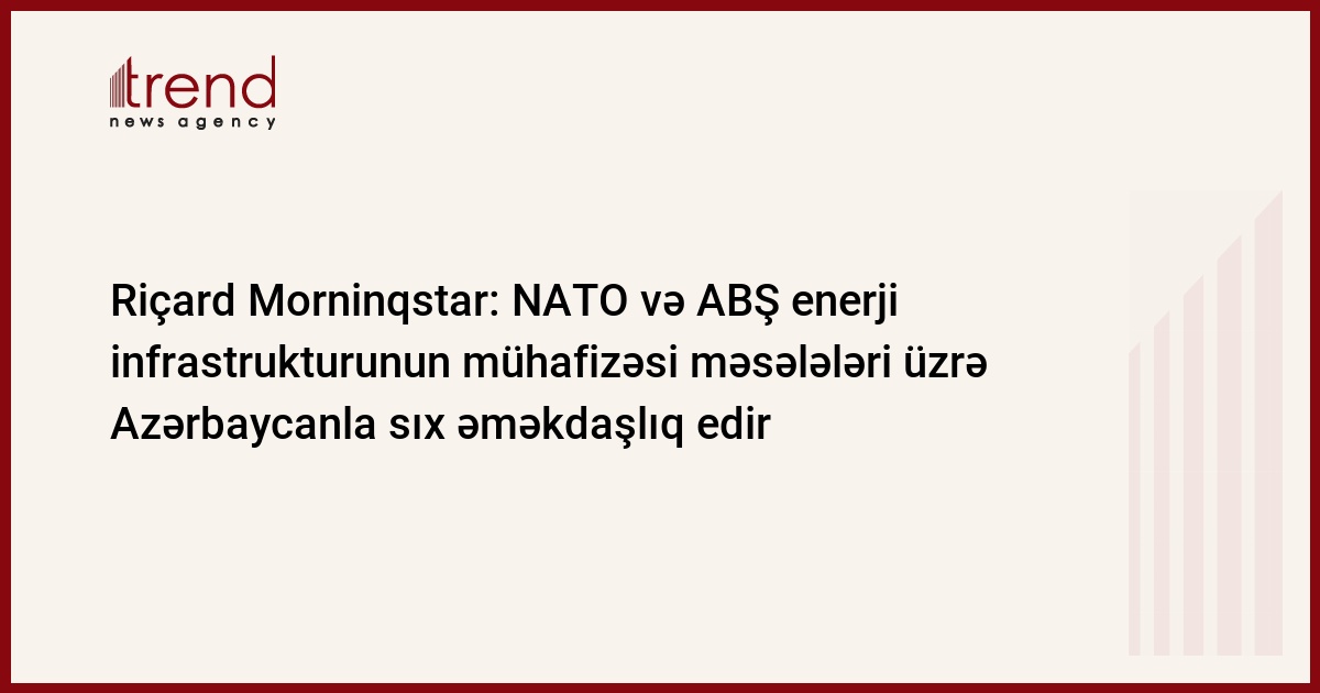 NATO və ABŞ enerji təhlükəsizliyi və enerji infrastrukturunun mühafizəsi məsələləri üzrə Azərbaycanla sıx əməkdaşlıq çərçivəsində işləyir və işləməyə davam edəcək. Trend-in məlumatına görə, bunu cümə axşamı jurnalistlərə ABŞ-ın Azərbaycandakı səfiri Riçard Morninqstar deyib.