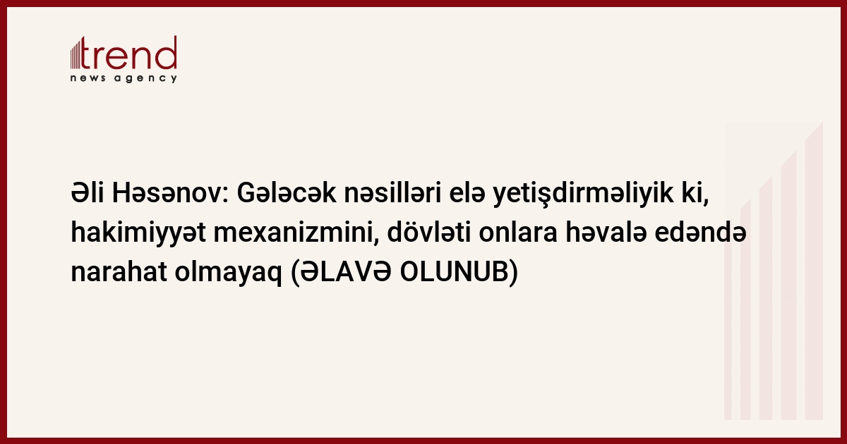 Həsənov deyib ki, indiki gənclər təxminən müstəqilliyimizlə yaşıddırlar: "Yəni gənclərimiz indiki dövrün, cəmiyyətin övladlarıdır. İndiki uşaqları necə böyüdürüksə, ona da layiqik".