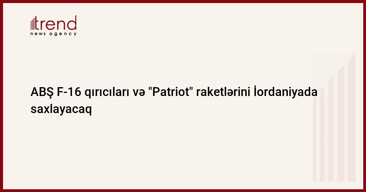 ABŞ birgə hərbi təlimlərin keçirilməsi üçün İordaniyaya göndərilmiş F-16 qırıcıları və "Patriot" zenit-raket komplekslərini Krallıqda saxlayacaq. Trend RİA Novosti-yə istinadən məlumat verir ki, bu barədə Pentaqonun yaydığı xəbərdə deyilir.