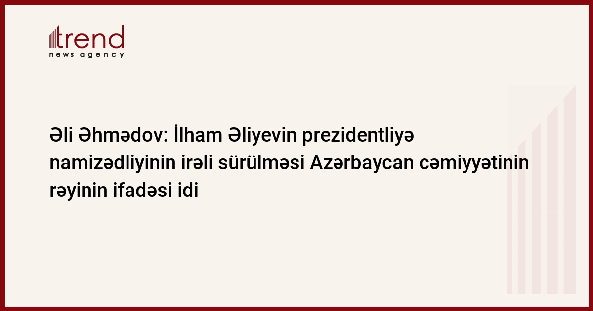 Dövlət başçısı İlham Əliyevin qarşıdan gələn prezident seçkilərində namizədliyinin irəli sürülməsi Azərbaycan cəmiyyətinin rəyinin ifadəsi idi. Trend-in məlumatına görə, bunu Yeni Azərbaycan Partiyasının (YAP) sədr müavini - icra katibi, millət vəkili Əli Əhmədov YAP Qaradağ rayon təşkilatında ərazi ilk partiya təşkilatı sədrləri ilə görüşündə deyib.
