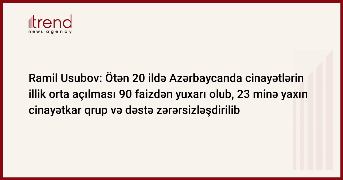 Artıq neçə illərdir ki, Azərbaycan cinayətkarlığa qarşı mübarizədə və əmin-amanlığın qorunması sahəsində dünyanın öncül dövlətlərindəndir. Respublikamızda əhalinin hər 100 min nəfərinə düşən cinayətlərin sayı ötən 20 ildə orta hesabla 220-yə bərabər olmaqla, əksər dünya ölkələri ilə müqayisədə faizlə yox, dəfələrlə azdır. Trend-in məlumatına görə, bunu daxili işlər naziri, general-polkovnik Ramil Usubov Prezident, Silahlı Qüvvələrin Ali Baş Komandanı İlham Əliyevin iştirakı ilə Azərbaycan polisinin yaranmasının 95-ci ildönümü günündə - iyulun 2-də Daxili İşlər Nazirliyinin Polis Akademiyasının Heydər Əliyev Mərkəzinin açılışında çıxışı zamanı deyib.