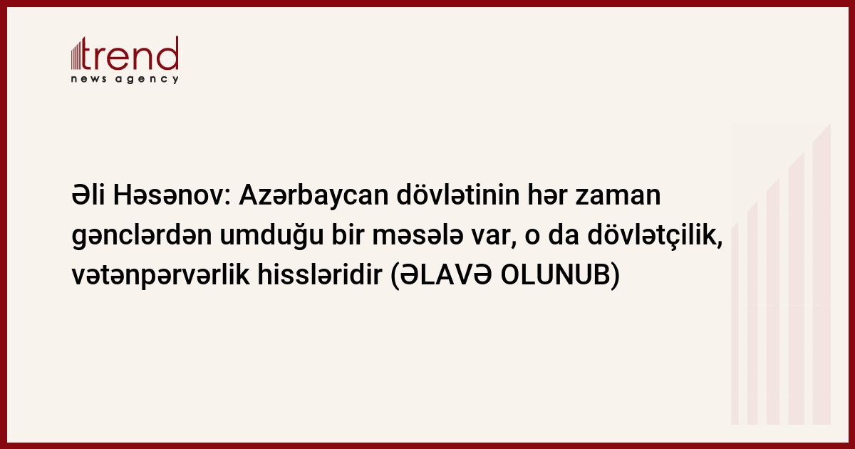 Azərbaycan dövlətinin hər zaman gənclərdən umduğu bir məsələ var ki, o da dövlətçilik, vətənpərvərlik hissləridir. Trend-in məlumatına görə, bunu cümə axşamı "XƏTDƏ" Sosial Şəbəkə Akademiyasının hesabat konfransında çıxışı zamanı Prezident Administrasiyasının İctimai-siyasi məsələlər şöbəsinin müdiri Əli Həsənov deyib.