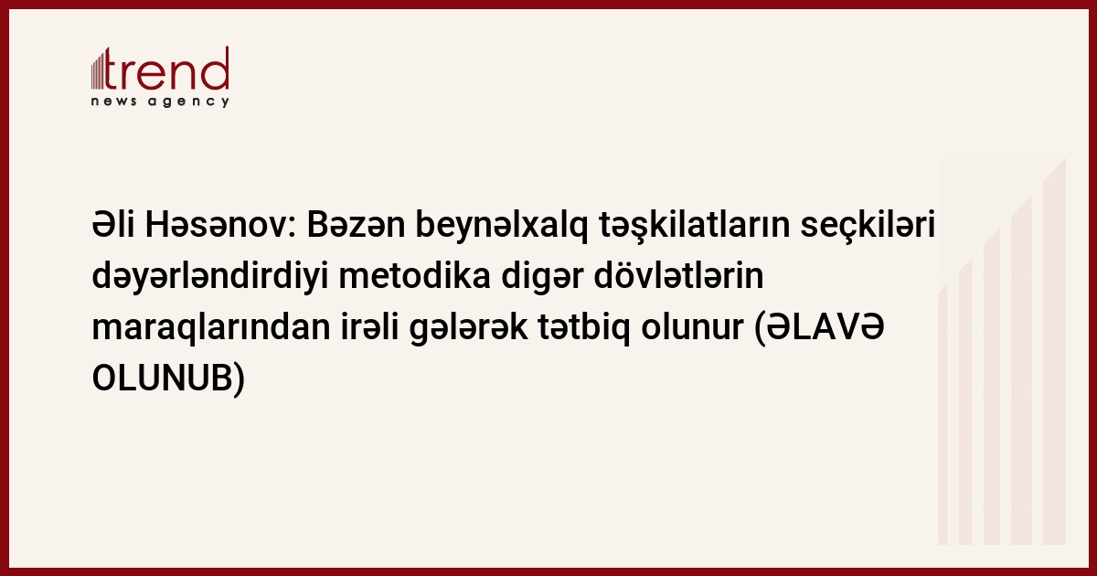 Bəzi institutların tətbiq etdiyi metodologiyalar digər dövlətlərin daxili həyatını tam xarakterizə edə bilmir, xalqların mentalitetini nəzərə almır, tarix boyu formalaşmış ənənələri nəzərə almır. Bəzən xarici aləmdə dövlətlərin idarəçilik sistemlərini, dövlət idarəçilik rejimlərini, onların fəaliyyətini dəyərləndirmək üçün istifadə olunan metodika, məqsədlər, məramlar və bilavasitə müdaxilələr müxtəlif dövlətlərin, qurumların maraqlarına xidmət edir. Trend-in məlumatına görə, bunu Azərbaycan Prezidenti Administrasiyasının İctimai-siyasi məsələlər şöbəsinin müdiri Əli Həsənov çərşənbə axşamı Mərkəzi Seçki Komissiyasında (MSK) Dairə Seçki Komissiyalarının (DSK) sədrləri üçün seçki hüququ üzrə ixtisaslaşdırılmış kurslarda "Seçki (referendum) prosesində aşkarlıq institutları və KİV-in rolu" mövzusunda mühazirəsi zamanı bildirib.