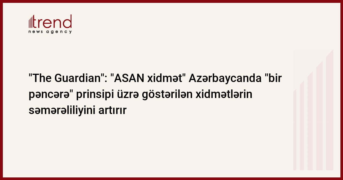 Azərbaycanda "bir pəncərə" prinsipi üzrə xidmətlər göstərən yeni innovasiya agentliyi xidmətlərə çıxışı daha da asanlaşdırmağa, korrupsiyanın səviyyəsini azaltmağa çalışır. Trend-in məlumatına görə, bu barədə Azərbaycan Hüquqşunasları Konfederasiyasının (AHK) baş katibi Kamal Cəfərovun Böyük Britaniyanın nüfuzlu "The Guardian" nəşrində dərc edilən məqaləsində deyilir.